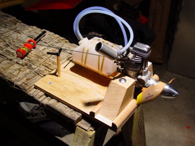 The throttle wire has a wing nut on a 1/4-20 bolt that locks/releases for adjustments. There is plenty of area on the motor mount,(firewall), surface to add blind nuts. I use the same motor mount that is going in the plane. The base is easily screwed to a saw horse or bench, etc. This is my .91 Saito on the stand. It is OK on the saw horse but I would weight down anything bigger. I will soon be bolting on my new 150 Saito to the saw horse. I've seen flying pizzia boxes, dog houses, etc. but a sawhorse!!!