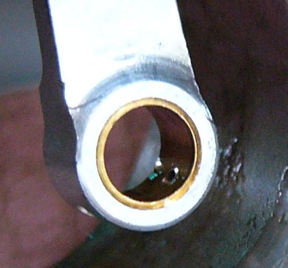 Almost all conrods only fit one way on the crankshaft so you'll have to look carefully at the bottom bush in your rod. One end of the rod will have a chamfer in the bush like in the first photo below and that goes up against the crankweb, in other words it faces to the front of the engine. The other end of the bush will be machined flat to the rod as in the second photo and that's the end you see when you take off the backplate. Find that chamfer and you'll know which way the piston should be so make a mark on top of the piston pointing to the front or maybe to the exhaust, whichever suits and that you'll remember. To the front is probably better because that's going to be the way the chamfer in the new rod will have to point.