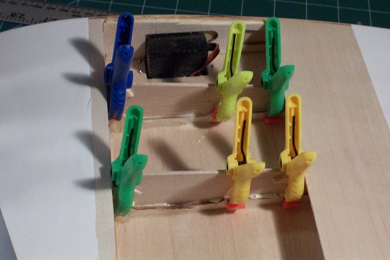 I used the cardboard template to cut some vertical supports to fix the remainder of the ribs. With the grain of the ribs runs fore/aft providing good longitudinal support I decided to add the supports running vertical to aid in compression strength. I measured back from the spar for the correct location of the braces and then drew their location on each side of each rib. Thick CA and clamps where used until they cured.