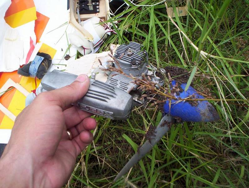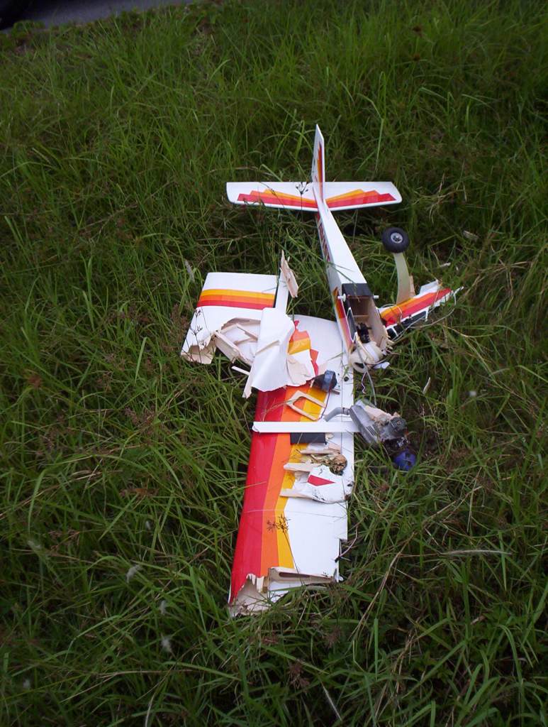 I was just doing some lazy touch n' go's and practicing my approaches. I wasn't wringing it out like I usually do, the irony eh? When I was at my 270 deg for my next go for a touch n' go, I peeked down at my radio to check my timer (bone-head move I know). I mis-judged the distance of the plane from me and to a stationary structure (so I thought), when the structure just reached out and sheered the right wing panel completely off which caused the plane to continue on a death spiral 'Top Gun' flat spin into the ground.
