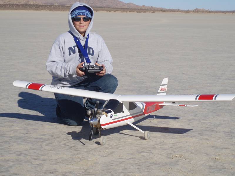 Just an update. Tanner flew again this weekend. Wind came up to 10-15 mph and he flew just fine. Of course on the lakebed you can turn into the wind for take off and landings, so no side slipping, it's kind of cheating