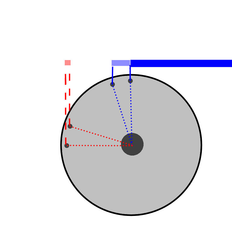 Here we have a servo wheel with a pushrod connected. Pushrod is blue and connected at 12o'clock. You move your stick 15degrees and the servo moves the amount shown by the blue dots. Pushrod moves the light blue amount.