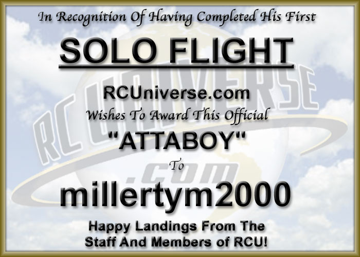 I finally got my new trainer set up right and took it out for the first time.. I didnt use a instructor witch was probably stupid but I could'nt wait. I've logged a lot of time on a sim and felt good about it. I took off with no problem, did some circles and figure eights. Then decided to start making some passes to get the feeling for landing.. Made about five pass before I felt good about tring to land. There was a little bit of a cross wind ( maybe 5mph, gust of 10) I brought it in and landed in one piece. Cant wait to get out and fly again. I think my wife is tired of me telling her the story about the flight. Just wanted to tell everyone thanks for all the help.. with me being a beginner I sure needed it..