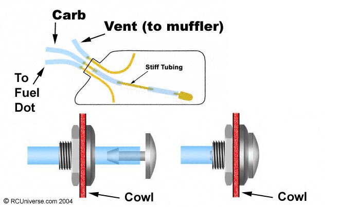 a fuel dot is used with a 3 line tank system....1 line from the muffler to the tank for pressure, 1 line from the clunk in the tank to the carb, and a 3rd line from a second clunk in the tank to a fuel dot. A fuel dot is just a collar around a hole in a cowl. The 3rd line is used for re/de fueling..and has a stopper in it when not in use to keep from venting pressure in the tank, and to hold the line in the fuel dot,