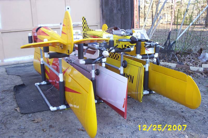 I use a system the same as Safebet. I designed it to carry 4 planes. The only difference is that mine has PCV tubes that rotate over the top and latch on the opposite side. I place the unit in the back of my pick-up and then load the planes in there respective slots. Ithen use a cargo net over the top. I also use a cargo rachet strap around the legs but I really don't think it is nessary but I use it anyway. Wish I had a canopy or a trailer but have a wife and kids instead.
