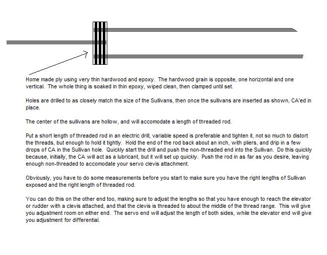 Anyway, I used the Sullivan Composite rod, http://www3.towerhobbies.com/cgi-bin...?&I=LXFV44&P=7 and a home made piece of plywood. See the below drawing. This setup, if secured properly (sand the sleeve at the hard points at formers, cut a slot the size of the sleeve or drill a hole in the former to accomodate the sleeve, then epoxy it in place at each former) is very strong and works well even up to 2 meter pattern.. so it will work on just about anything. It takes some time to do right, but it works and allows adjustment for both length and differential.