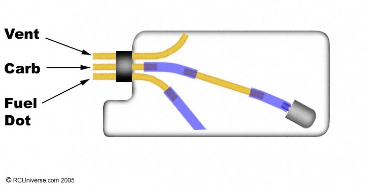The line that points to the bottom of the tank is the fill/drain line and should be plugged tightely when the plane is running.