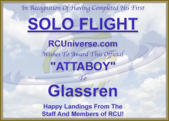 Hooked to a Buddy Box my trainer took off and let me fly a basic pattern through 1 tank full. 2nd time out I tried to take off but this is the one thing very different from the simulator. In real life you must use FULL Throttle. Tall grass saved all but my prop and 2nd time around no problem. Flew awhile and even landed on my own.