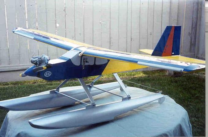 With the heavier engine, fuselage alterations for float attachment and radio equipment, all up weight is 4 and 3/4 pounds... add a little less that two lbs for the floats when used...