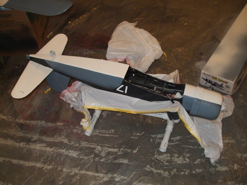 Just an update on my painting progress. We masked and paineted the intermediate blue last night. My buddy got sick overnight so I decided to venture off on my own tonight and go for shooting the white underbelly. I think it turned out pretty good for a first time painter like me. I am quite pleased. Now it's on to decal application, final ballancing and testing so I can maiden her later this month!
