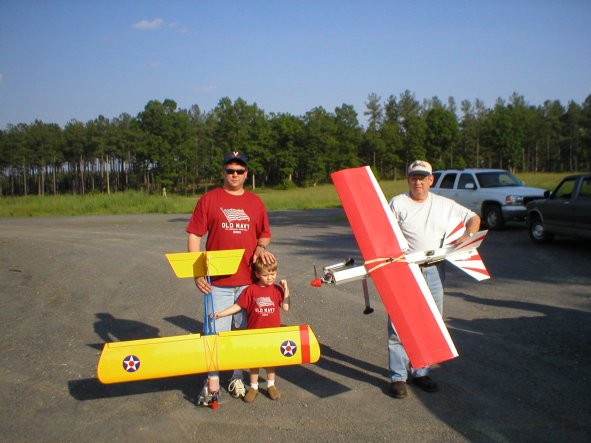 I've yet to take off myself however today I made my first landing. My instructor absolutely great, the man with the majic thumbs. I flew my spad in patterns and eights both ways and made a couple approaches. On final just as the plane passes me it revs up and I think that he has taken over control so I just let it go. It lands hard and bends the home made aluminum gear a little. Come to find out, he hadn't taken over at all, it was just running out of gas and reved up. Go figger. Next flight went better after remembering to reverse the xmitter I was using. That was wierd everything going backwards. Once we switched it all was fine and I made my first pass to land a little too high so I went around again. I cut the throttle on downwind and let it settle in on base it went by me about four feet above the ground and settled in for a three point landing. Some of the other guys asked who landed it me or Dave. Now thats a real compliment considering this fellows ability. I know it may not be a true solo but I feel real good that I got it on the ground and all in one piece. See a pic of my plane, built by my son-in-law. It has a OS .46LA Futaba radio and servos. Here's a pic.