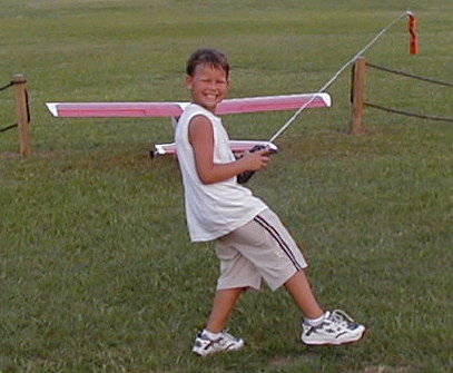 Yes Alex is six. He has been around airplanes since he was able to walk. Alex would retrieve our planes when there was a dead stick. we instructed him to turn the air plane off and to straighten the prop. and pull back to the pits by the tail wheel. Of course the first year he would only carried the transmitter. He would only break from playing with his toys when there was a plane to retrieve. He never really showed much interest until recently.When he was four I would pretend to allow him to fly on the buddy box. June 15th Alex said dad I want to fly. Really this time. After about 5 flights we went to the Youth Masters. June 20th at the Triple Tree Aerodrome, Alex successfully landed. 600 feet down the runway, dead stick never the less. When we got back home he had some rather hard landings. Two weeks in a row. The last fix was 3\8 x 1 1\2 spruce behind the firewall for bracing. Last Sunday I was not planing on letting him solo but he did so good and made some really nice touch and go's. 7\20\03 at 8pm I pulled the cord. Of course I will continue to use the buddy cord when there is a lot of people around. He is only six. You can never be to careful in this hobby. Special Thanks to Great Planes and Real Flight ( Knife Edge Software)