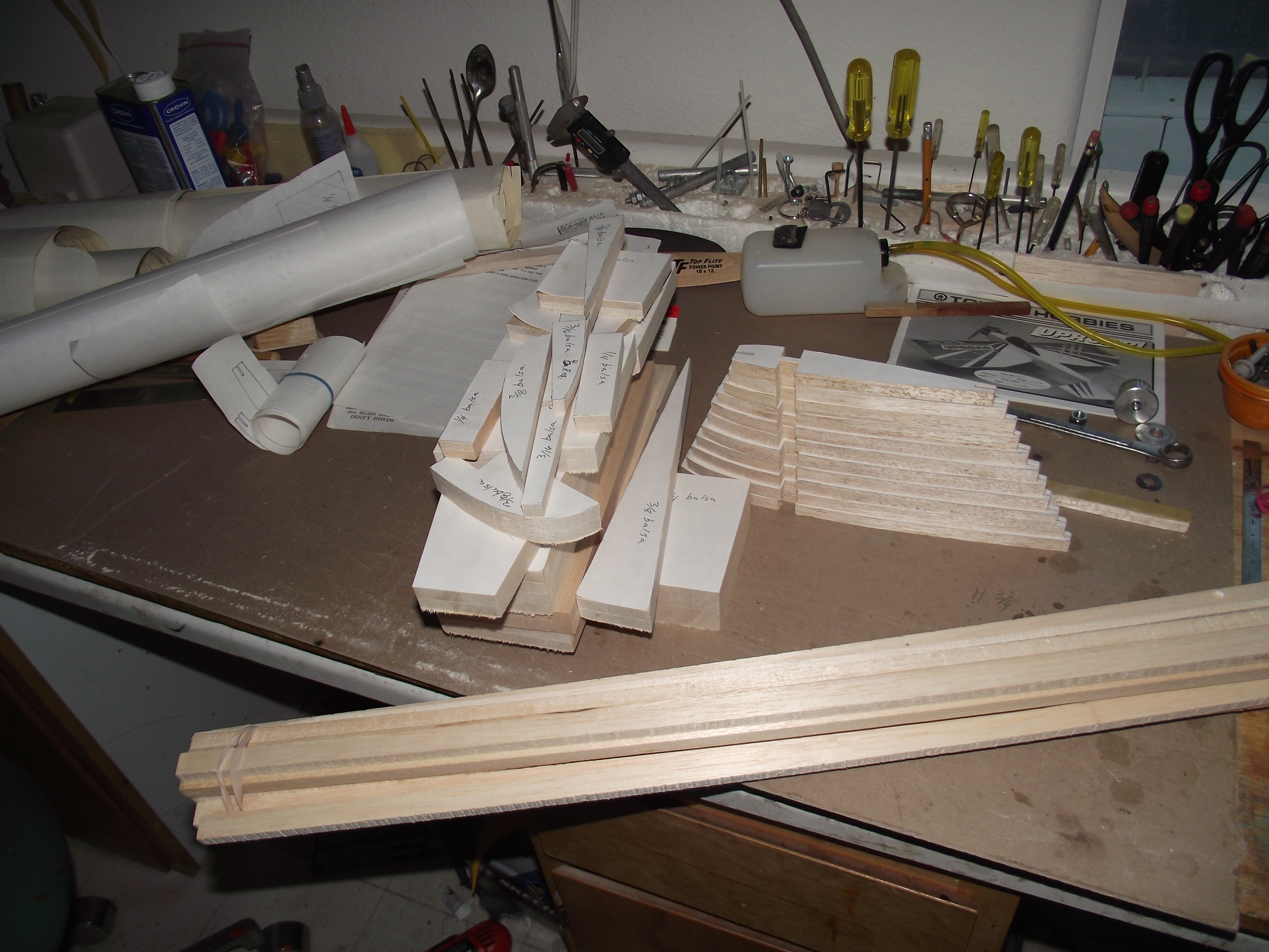 I once was given the Bridi Dirty Birdi kit and made templates for ever part. I have built a bunch of Joe's kits and we used to go directly to him for special runs of kits for our clubs and our open raffle and auction, usually the Kaos. I like the pattern planes and the Kaos and Birdi are my favorites. I have been cutting two of the DBs, one for myself and one for a friend. I cut all my own wood too from blocks so I can be selective and get any size I need. I have stalled on the cutting due to mad money and just need the wood for the fuse sheeting, I should have that very soon and get them finished. I ran out of the long blocks.