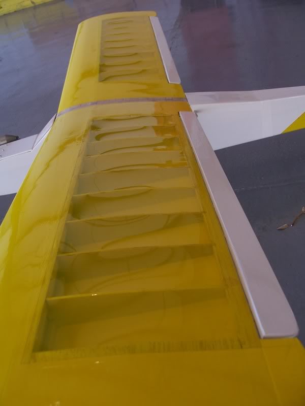 It is difficult to work when I know this thing is sitting at home waiting for me. I installed DuBro gear in lieu of the supplied gear. I am much happier with the stance, prop clearance and sucurity. I covered one wing in the base color of yellow and will be putting the green patterns on tonight. The laser charring shows throught the covering a bit, whick I'm not real pleased with. Too bad the kits don't come with 3 wings. You could get that 1st practice wing out of the way and install the best 2/3.:D