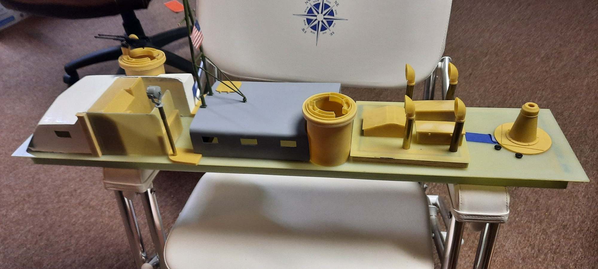 .....work was started on the superstructure using Garolite G10...all windows cutout....built up day room cabin and work started on the cockpit.......the 36 " Access hatch has been cutout and disgarded.... it's been replaced with a strong Garolite G10 Fiberglass access hatch....plenty of room to access the the running gear and hull area.......all necessary paint is included .....$300 invested in [4] quarts of Klass Kote epoxy Primer + IAF epoxy flat upper surface green +. dark red flat epoxy bottom paint...