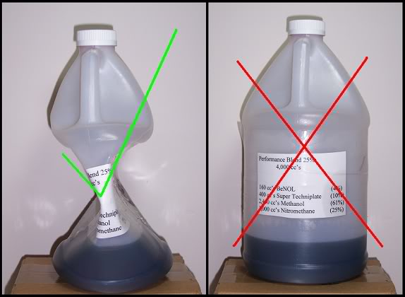I do not mean to knit pick at you guys but I noticed something that needs to be corrected about how to tell if your fuel is bad. Those little droplets are not water. They are actually Alcohol droplets from the fuel. Alcohol has a very Rapid evaporation rate. Which given time in warm conditions accelerates that evaporation. If you look at your fuel bottle on any given day, you will see tons of tiny droplets on the inside of the bottle. These tiny droplets are the alcohol (methanol) that is evaporating out of the fuel. Most believe these droplets to be condensation bit it is not. Like I said.... not to knit pick but thought I would share that info with ya |