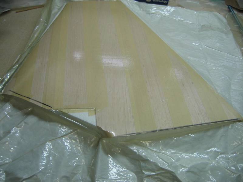 As with bagging any part, cut the sheeting to be only slightly larger then the part, otherwise the bag will crush the wood. Also make the sheeting into a "book" by taping the trailing edge together. so you put a rudder sandwich into the bag.