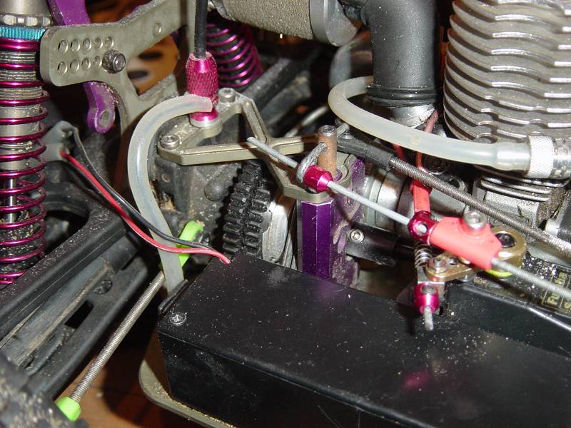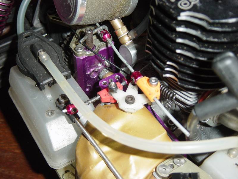 During the rebuild (sorry, Santa stiffed me on a digital camera so no pics of the rebuild yet, Got some nice new ink instead!!) I have changed the throttle servo also and the previous owner had both linkages coming off a one sided arm, the std rcvr/batt box obviously is in way, so I found a different arm and adapted it to clear the rcvr/batt box so now the linkages run off opposing sides of the servo and now i seem to have straighter lines to the carb & brake. NOW my Q is....What is the Learned One's prefered way of placment of springs, bits of fuel line, stoppers, grommets, incendary devices and crack pipes to ensure smoothest operation. By the way the last two items were just to see if you read the whole thing
