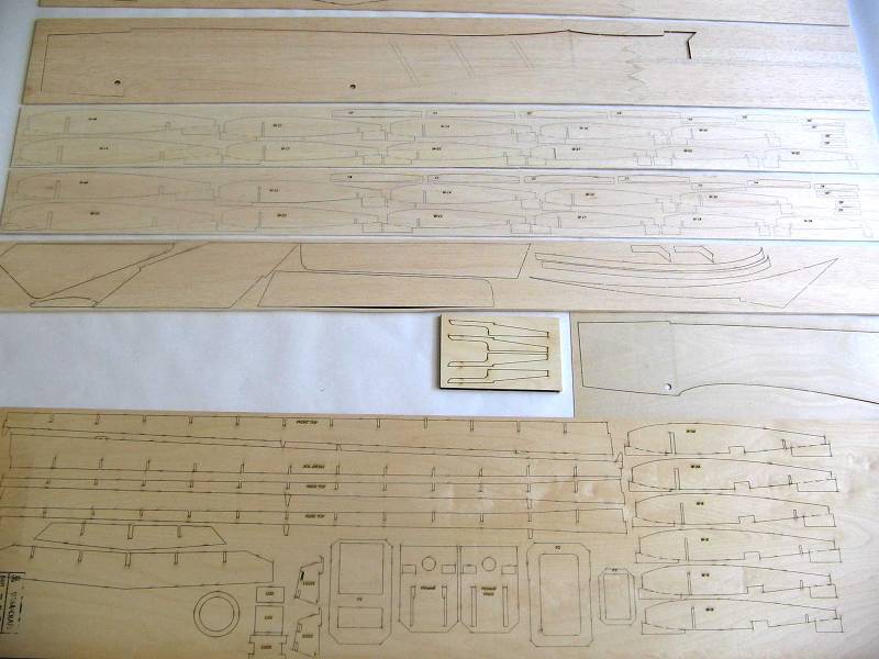 Anyway, here are some pictures of the laser parts as I got them out of the box. NOTE: The fuselage sides on this prototype show a zig-zag joint at the rear. This was requested by me to get a kit in house and started sooner instead of waiting on a balsa order. The final kit will have a one piece fuselage. Now note the 2 piece shown below is from the original kit. Look closely and you can see the saw marks in the balsa!!