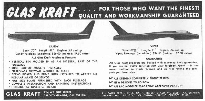 Add this into your database. Marty Moad's "El Toro". Torpedo .45 power, Bramco reed radio vintage 1961 design. I'm working on an AutoCad plan for this. I also included an ad from Glas Kraft for the Candy and Viper, vintage 1965.