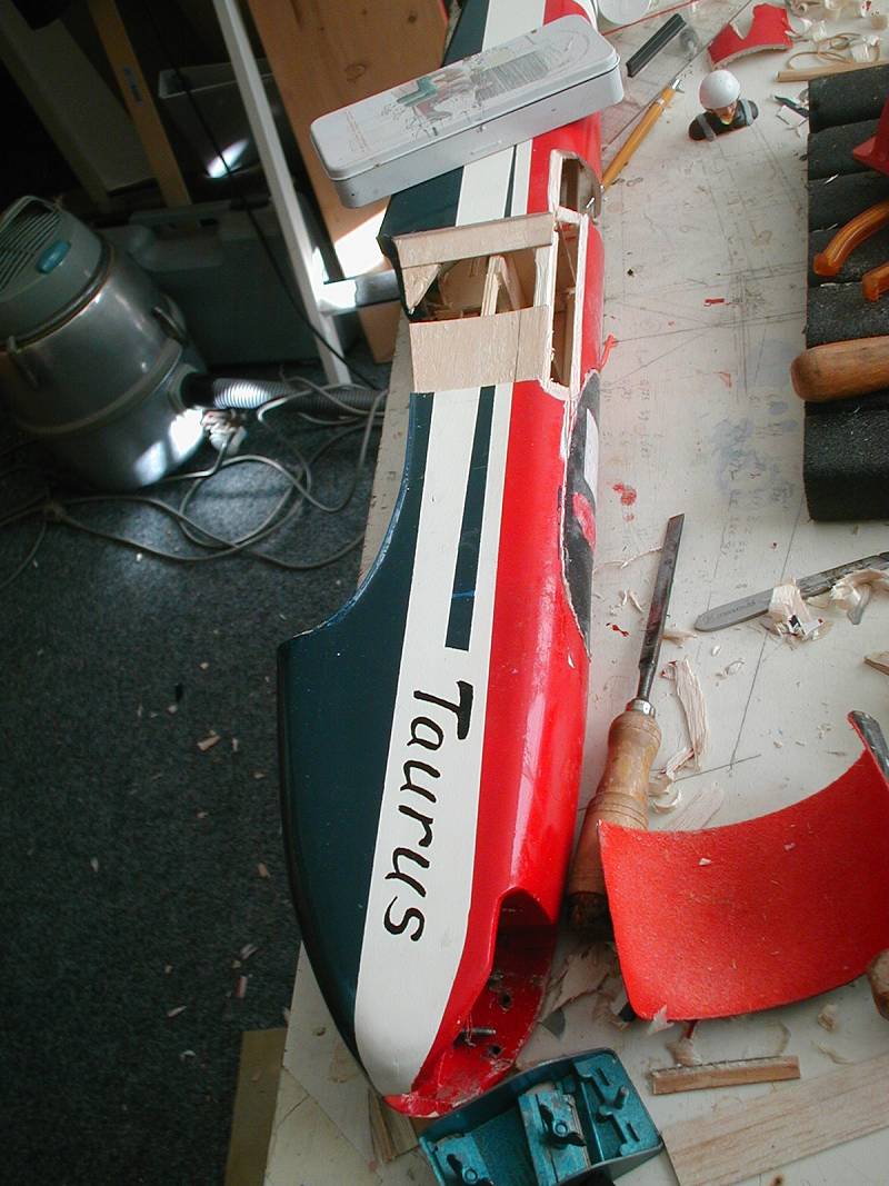 I did mount the front and backside of the fuse on the bench in right position and rebuild the splintered section.