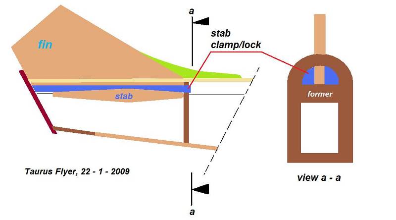 To get a rigid mounting of the stab, also I can change, I use a clamp in the last former in the fuselage in front of the LE of the stab.