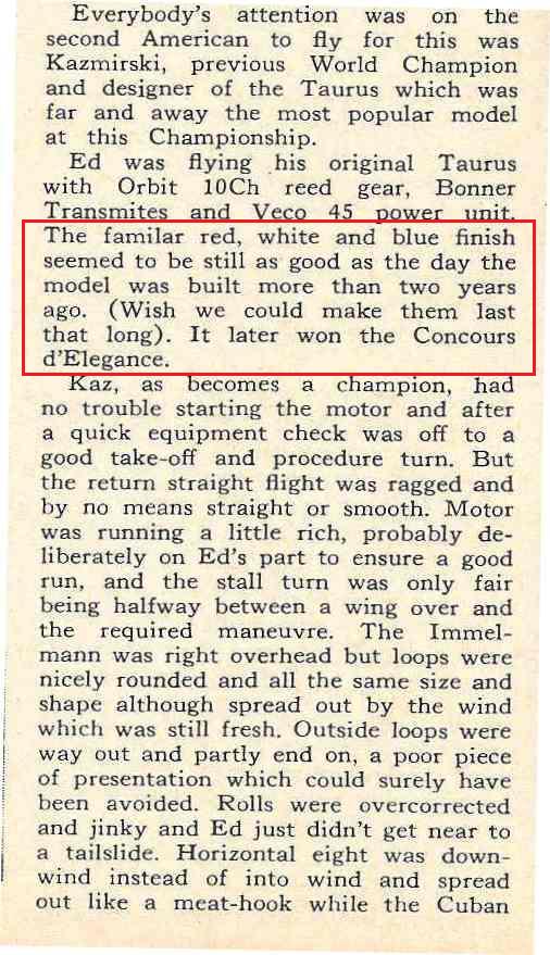 The reporter of American Modeler does write in the article about the Internationals, August 1963, Genk, Belgium the Oldest Taurus on Earth should have been more than two years old and winner of the Lufthansa awarded trophy for Concours d'Elegance.