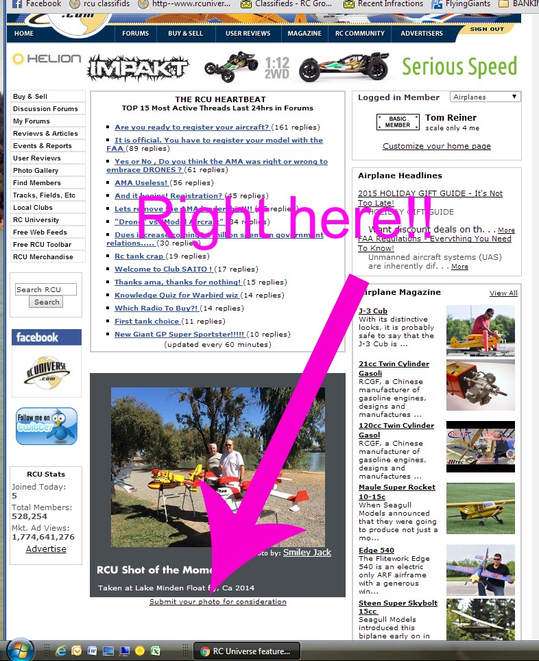 4. Once you have the photo in your gallery you need to use the Shot of the Moment app, click below the picture "Submit your photo for consideration". This will take you to a page that gives you instructions for submitting your photo for consideration. But to boil it down to the basics you will go to your photo in your gallery and use the "Tell a friend" link in each photo and then supply it with the email address of [email protected] to send that link to. In the comments area tell us anything you want us to know about your picture and your plane. We'll be more than happy to get your pride and joy up on the front page of RCU to share with everybody else!!!
