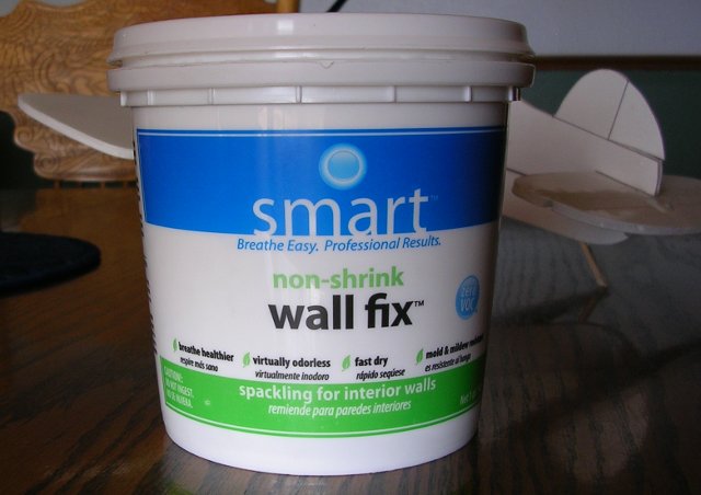 The Ring GB has undercarriage and controls installed. I patched the various gouges around the foam board edges with Smart Non-Shrink Wall Fix. It is lighter in weight IMO and better than standard spackling compound for fixing dings and imperfections in foam, balsa, etc. It is snowy white in color, is easy to spread with the fingertips. Next is installing the wingtip line guide and preparation for painting.