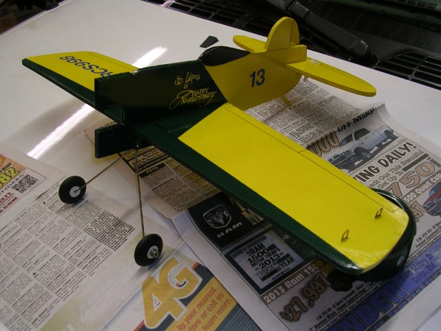 After a second coat of yellow, I've got her masked off and trim painted. The trim on the original Gee Bee Z was involved with scalloped wing, fuelage and elevator trim. It is more important to have something that looks reasonable but ready to fly soon, so I simplified the scheme, easy to tape.
