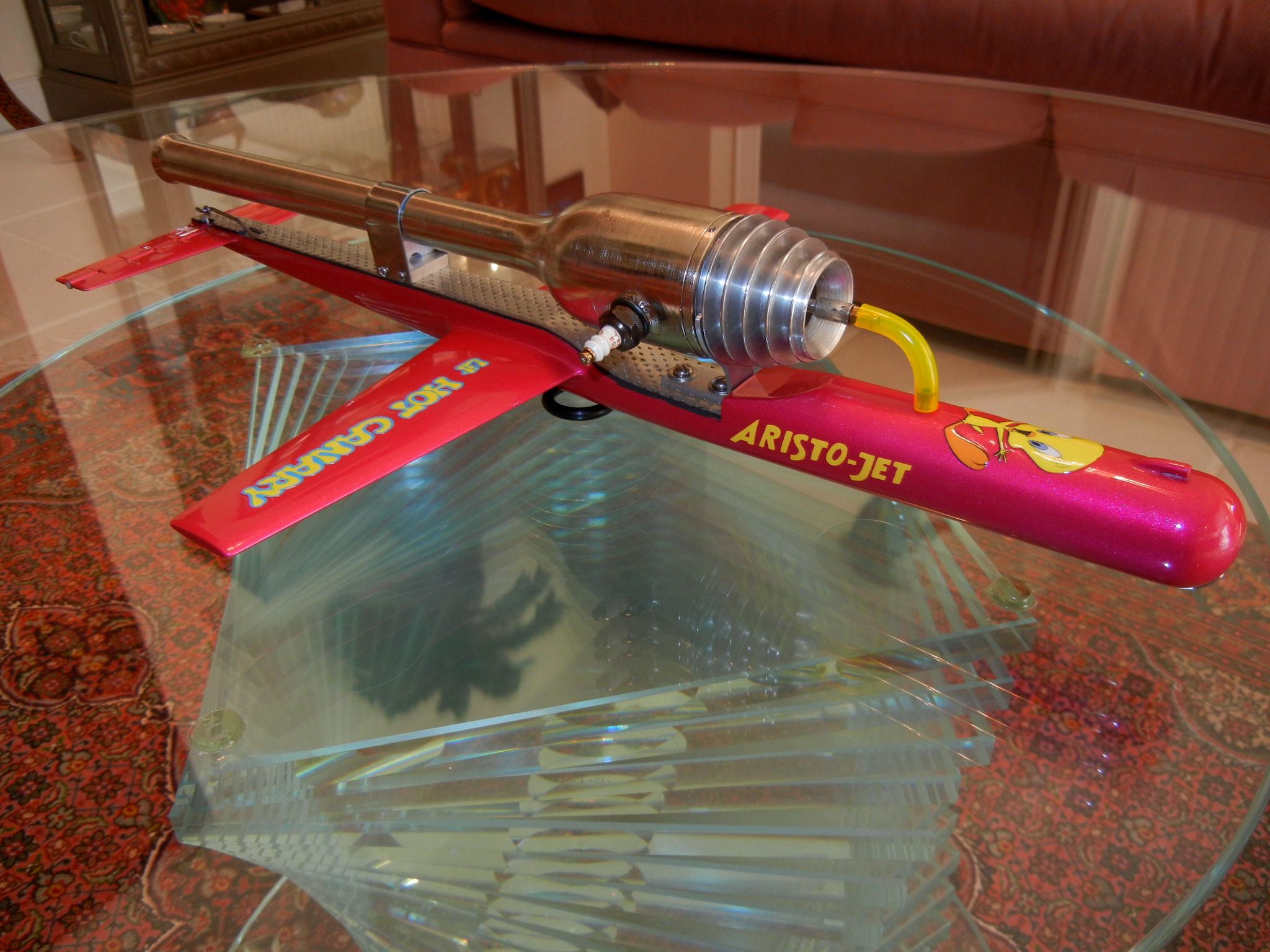Here is my 10" wingspan Lil' Hot Canary with a 13" long, 1955 German Aristo-Jet engine, the same company who made the Hurrican-Jet. The pink color is a tribute to a friend's full-size H.C. t