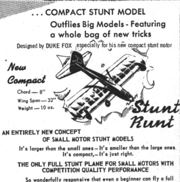 Not to be confused with the Joy Products biplane of the same name, Thi plane was designed by Duke Fox for the Fox .07 compact stunt engine.