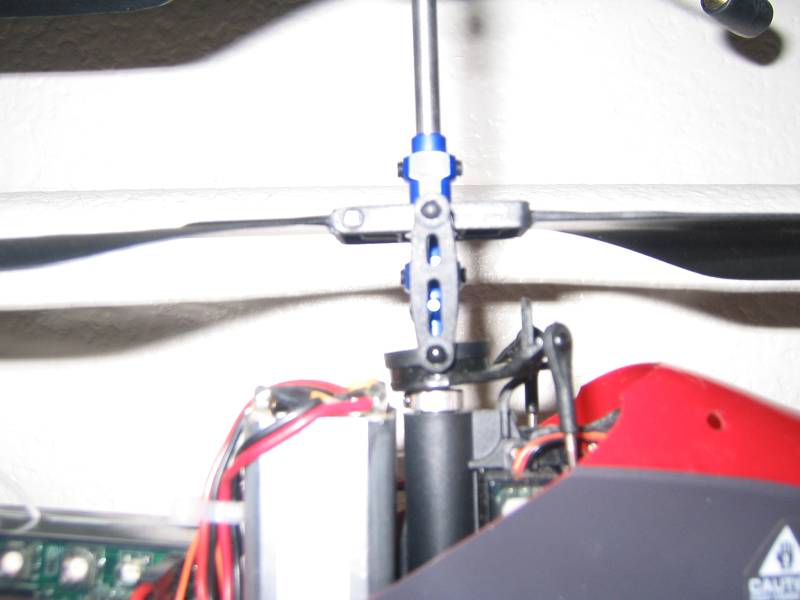 Hmmm... just got doen replacing the flybar and the lower head/shaft (?) with the blue aluminum... now, when I try to fly, she immediately starts to skitter left and tips over?? I will include some photos... can ya'll see anything wrong? I have been trying to adjust via trims and can't keep it from leaning/tipping left during takeoff... never did that before? Any ideas or suggestions appreciated. I even tried to set all the trims to the right and she still tipped left. Also, I notice when I use the toggle on the right side of the remote... and push it left... the blades hardly change. Please also note in the photos... the bottom of the shaft... is it supposed to be tilted forward or should it be sitting evenly? Mine is tilted forward, can't recall if it was like that before or not?
