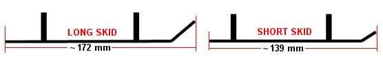 The Gaui 255 skids are 130mm long and 30mm tall. The pipes are about 85mm apart and the struts are spaced at about 75mm.