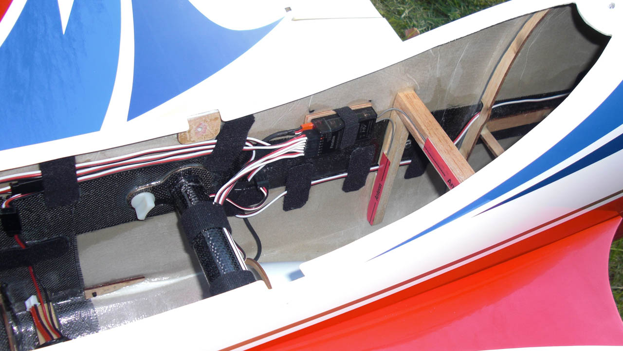 I was going to use a Secraft receiver mount and Secraft battery mount. Each would be mounted against the side with small basswood blocks.