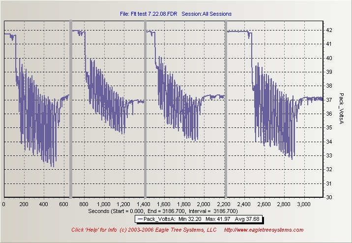 We then went to 13C, 15-17C, now 25C, next will be who knows what. The high C rated packs just do not provide a nice consistent power delivery. They give you buckets of power up front, to the point where its almost difficult to manage, then halfway through the flight it starts to fade....by the 80% mark its completely gone. A good old TP 5300 Prolite wont deliver as much up front, but will deliver MORE at 80% than a 25C pack. I have recorded enough eagle tree data to convince myself that its not just "me" seeing it, but a real event. Since the drop off is more dramatic, a 25C pack will tolerate less capacity loss (age) before it becomes a practice pack...therefore less useful cycle life.