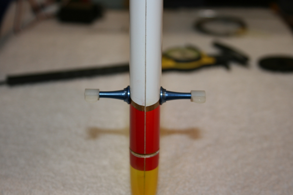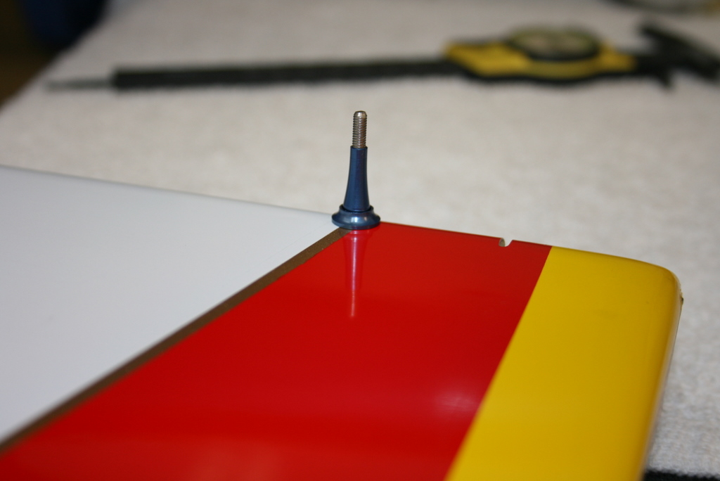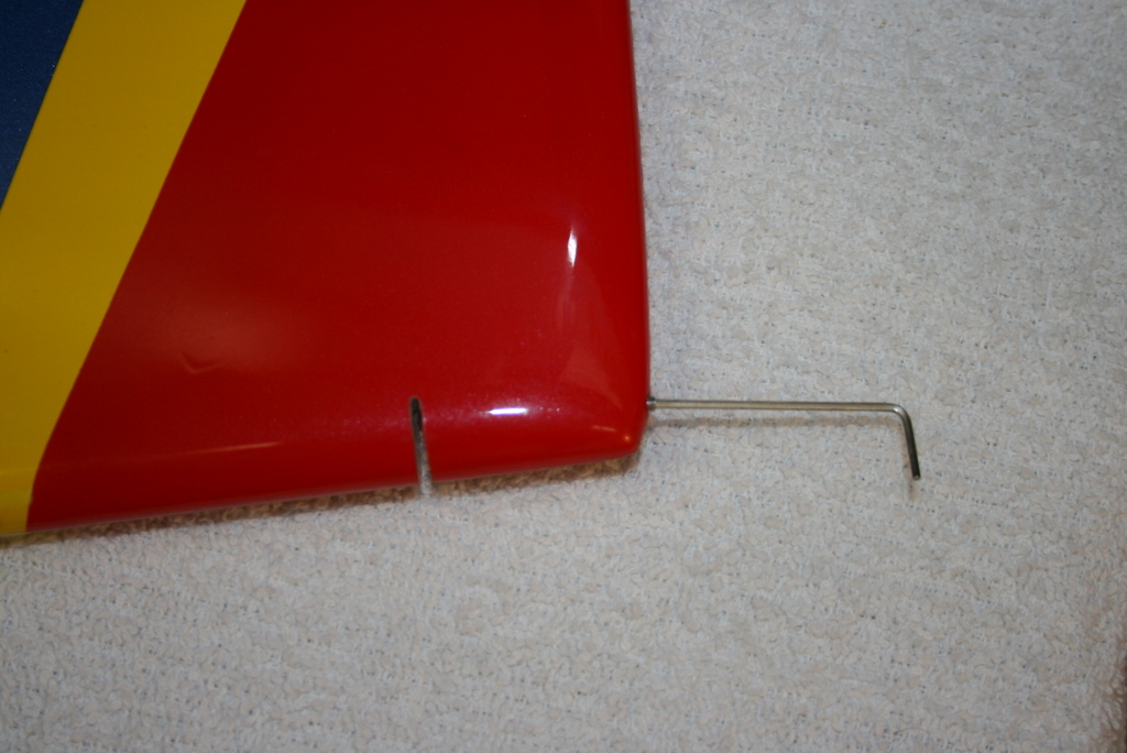 Installing the tail wheel is a snap... as you can see from the picture the tail wheel post is actually threaded and so it screws into the tail wheel post which is pre-threaded. It's just a matter of taking the tail wheel and turning it until it is almost locked and then connecting up the spring and attaching it to the tail wheel and to a screw that is screwed into the rudder. Next are the stabs - mounting them. I ran extensions down the plastic tube by taking a thin nyrod and feeding it through the hole in the tail toward the front. I used tape to attach the one end of the extension to the rod and then fed the rod through which dragged the extension. I also taped the other elevator extension to the 1st extension about 4" from the top and continued to pull the extensions through until both ends came out the front of the tube. Then I slipped the stab halves together and connected up the elevator servos to the extension leads and tied them together with dental floss to prevent them pulling apart accidentally. Once the stabs were full installed I screwed the bolts into the stab to connect to the stab tubes and to hold the stabs on... done.