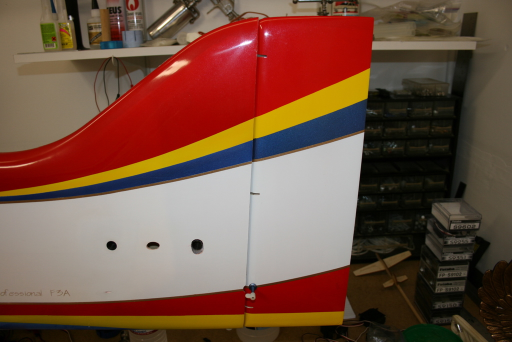 The next step is to mount the rudder to the hinges and to insert the piano wire from the top. Once the piano wire was in, I then screwed back in the set screw (with a little Loctite to hold it in place). Next came the rudder cable... I screwed on the plastic clevises and put a piece of fuel tubing on them to help keep the jaws closed. As you can see from the pictures the rudder cable (once cut in half) is just the right length. The next step was to mount the servo. I also cut the servo wheel to allow for an offset of about 6mm since the hinge point on the rudder is offset by a similar amount. I also drilled out the servo wheel to save some weight. The next step was to cut the rudder cable guides to the right length and then to connect the rudder cable through the rudder wheel and to crimp the ends. I used some brass tubing (from an old fuel tank) to put over the wires and a needle nose vice grip to crimp the brass tubing. After that it was just a matter of adjusting the clevises to tighten up the cables. As you can see I decided to replace the plastic clevises with metal ones - why? When I was tightening up the clevises the one clevis actually came off the cable ended (slipped off - perhaps wore out the threads).