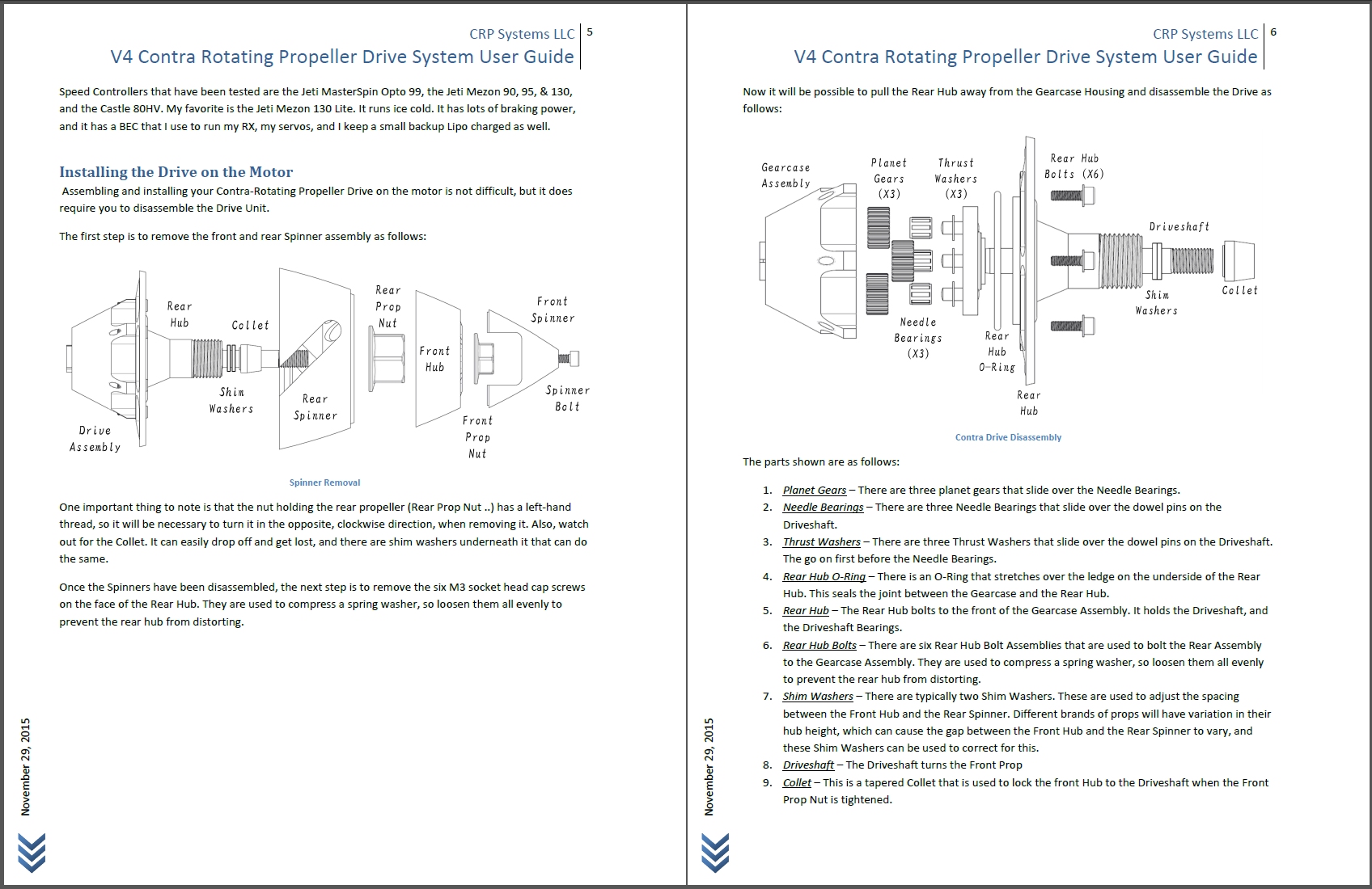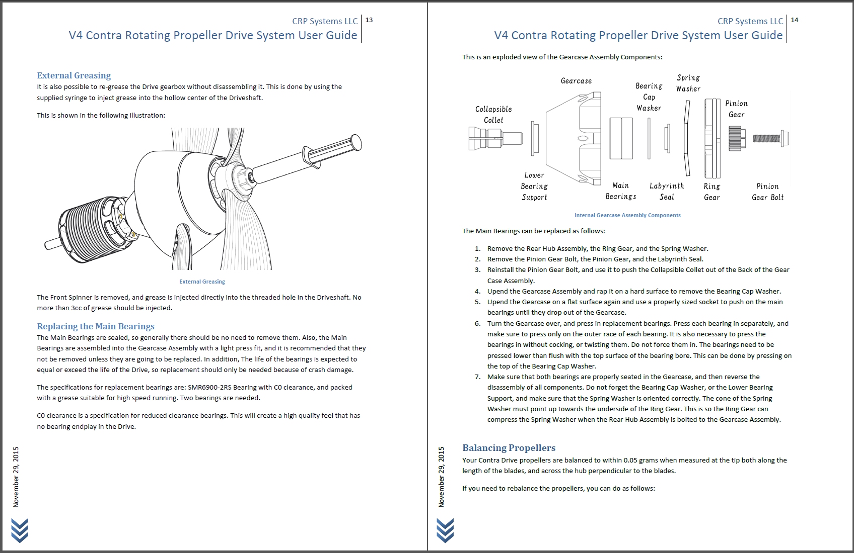 Very nice job on the manual Brenner. Your explanations and diagrams are very clear Having run one of the prototype V-4's for a while you covered all of the issues very well. I would emphasize that tightening of the pinion gear bolt is very important to be sure the Colette is set on the motor shaft. I thought I had it tight enough before you had the torque measurement but on one occasion I noticed that it slipped a little during flight. I re-tightened it at the field and had no problem. Also your hint about removing the Colette is important as it can get stuck and needs to be rapped to release it as mentioned in your manual. Re greasing and assembly of the drive are easier then on the V3 also the grease reservoir really helps as I went over 100 flights and the gears still had nice grease on them. Looking forward to buying one of the V4's to put back in the plane.