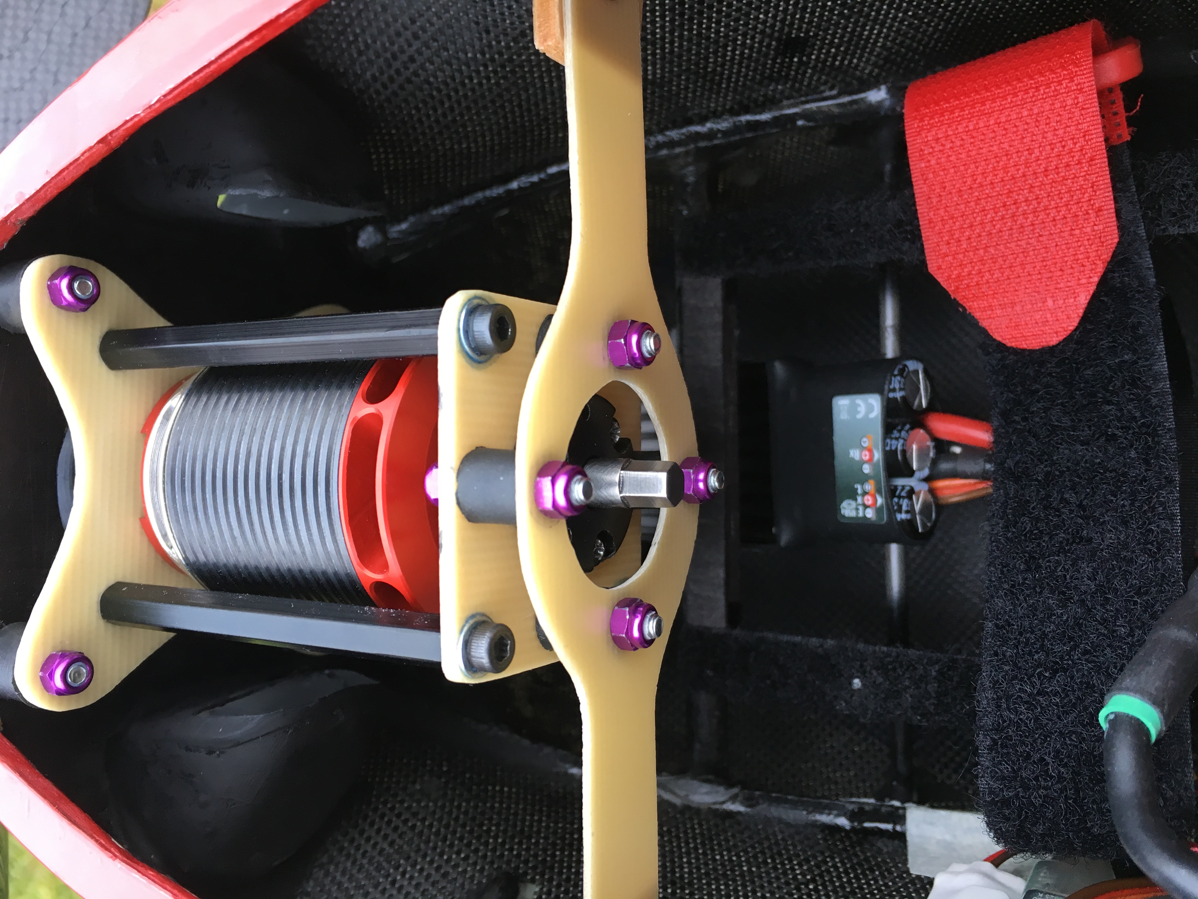 After gaining some knowledge with rubber damping the OS belt drive I decided to design my own motor mount for the Contra drive. One of the main motivation for designing my own was due to the “issues” that has been reported with the rear support bearing and twisting in knife edge manoeuvres in the F17 schedule. My mount eliminates that problem. The pictures explains it better than me.