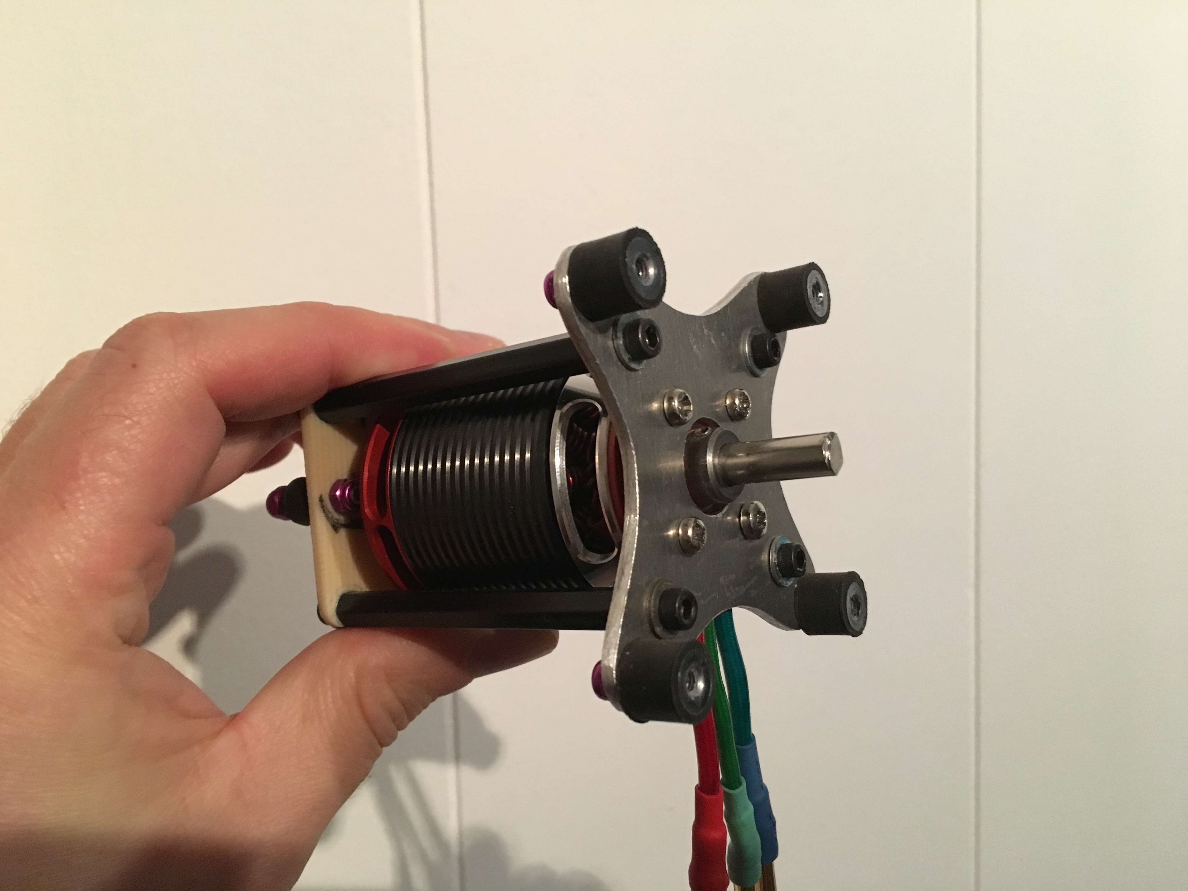 My last update to the motor mount has been to cut a front mounting plate out of aluminium to replace the old one made of fiber glass. The plate added 4 grams over the old one but with the increased cooling it should be worth it. The plate is cut from 2mm thick 5xxx alu alloy. 1.5 mm is probably strong enough but 2 mm was what I had laying around. I will add some Thermal paste used for computers between the motor and the alu plate to optimise heat transfer.