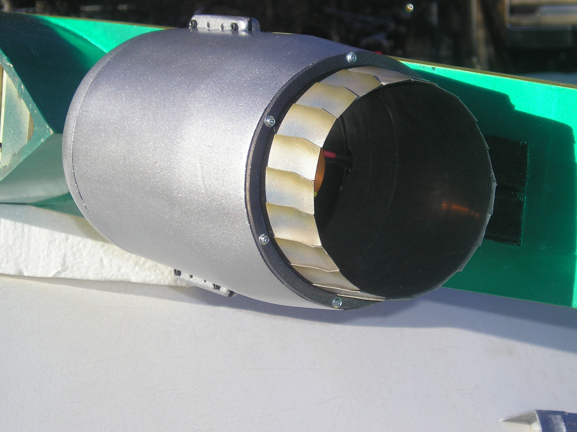 The spects are: WS 64", Length 68", Wing area 970 sq in, Weight 14 lb, Fan Turnigy 4.5, Motor Scorpion HK-4035-630, ESC Turnigy 100 amp, Battery 12s 5000 40C LiPo, Thrust ~10 lb, Amp Draw 62 amps, Watts 3.7 x 12 = 44.4 X 62 = 2753 watts, Timer is set for 8 minutes. Retracts, flaps, brakes. ~ 120mph.