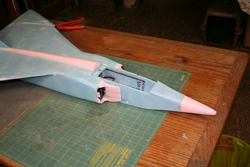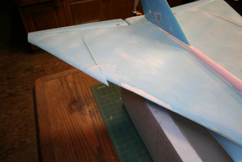 I just happen to stumble upon this thread as I don’t frequent this site much anymore. What caught my eye, was the plans you posted on the first page. I think those are the plans I used to start building my Arrow. I got the plans from pusher jets forum over on RCG. I scaled them up to get a 36†WS. I did take the liberty to modify the build a bit and incorporated Shumate style techniques in many areas. See the pics. I like the flow-through design as I believe it cools the ESC & motor more efficiently. Unfortunately, after a semi successful maiden flight, where the motor mount broke in half 4mins. In, the arrow went in hard on flight #2. I’m still a bit dumbfounded as to the cause. After the maiden flight in which I had to trim in a lot of up-elevon, to achieve level flight, I noticed after landing the amount of reflex was huge! I took this to be a nose-heavy condition. I was back ~1/2†from the CG on the plans. The plane was also a bit twitchy during roll maneuvers. The response to roll commands seemed to lag then roll quickly. I had read somewhere that if the leading edges of smaller planes were too sharp, that less than stable handling can occur. My leading edges were sanded to a sharp edge so I rounded them off a bit, added some tail weight to bring the CG back hoping to get rid of some of the reflex and went back out for flight #2. When I threw her up, I didn’t give any up angle to my toss, (I’m tossing off of a hill so 30’ straight out gets me 15’ of altitude). She just sagged down the hill and no amount of up stick helped. Into the weeds and shread the nose back to the intakes!! D@mn! I hate when that happens!! Accept for a few dings and missing chunks of foam, the rear & wing survived intact. I couldn’t believe she wouldn’t pull up at all! The only thing I could figure is the surface area of the elevons isn’t enough. So I’ve cut them off, widened the elevons out toward the wing tips. The overall shape of the wing didn’t change. I’ve about got the nose repaired and should be ready for round 3 in a week or two. The power system is no slouch at 450watts and an AUW as pictured at 52oz. If you have any insight to my dilemma and or any suggestions, they would be greatly appreciated. Here’s the specs on my Arrow; Blu-core, FFF construction. Wing and tail are double thickness. 36†WS, 49†length. BP 36mm 1500kv outrunner with a 60amp ESC, 3amp UBEC, 4s, 3000mah 20c Lipo with an APC 8X4e prop. HS-81s for elevons & HS-55 rudder. Also pictured is my FFF F-15 at 39†WS, 53†length. Same power system but an AUW of 62oz. and a wonderful flyer. Love those bigger jets! Blue skies.