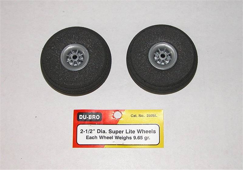 My 2" wheel upgrade didn't feel quite large enough and the wheels I had found at home were poor quality so I decided to buy some Du-Bro 2-1/2" (250SL) [link=http://www2.towerhobbies.com/cgi-bin/wti0095p?FVSEARCH=250SL&FVPROFIL=++&search3=Go]Super Lite Wheels[/link] with tread. The center holes were too big for my Superstar gear mains so I used some 5/32 diameter round aluminum tubing for inserts.