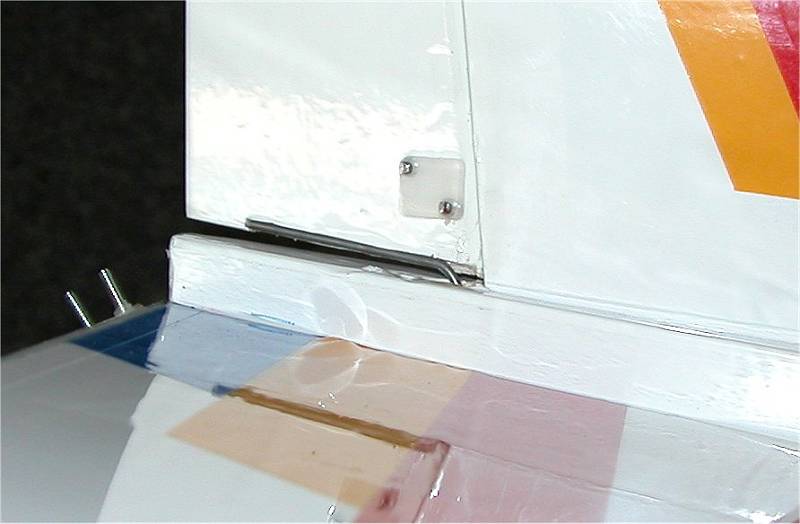 Finally I latch the bottom hatch with a 1/2" wide by 1-1/4" long white vinyl tab cut out of 1/16" vinyl sheet from the hobby shop. It is attached to the middle of the hatch at the front with a 2-56 bolt permanently and to the landing gear with a 4-40 nylon bolt which runs into a tapped hole in the middle of the landing gear. Loosen this bolt to take the hatch off.