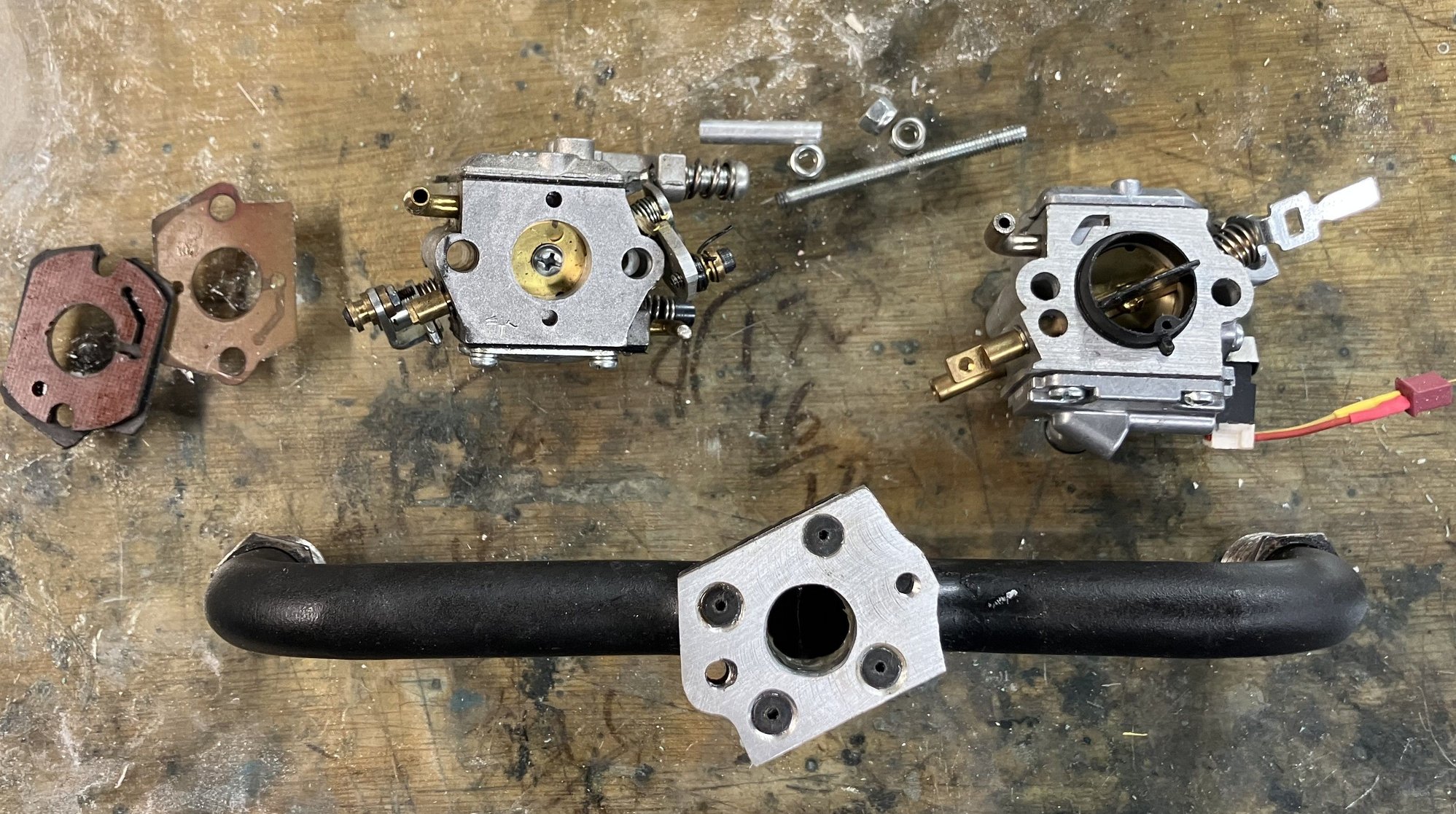Work is slowing on my 30% Piper Cherokee built so today decided to look at mounting the Zama carb on the Roto 85 FS. This engine was purchased around late 2018. During the built the carburetor flange was broken on the intake manifold. Little info was available at that time and I purchased the engine from an importer on Ebay. Made up a piece of aluminum that is screwed and glued on with JB weld. The repair worked well over the 5 year period that I flew the plane. The second engine I purchased a few years ago has a much more robust intake manifold.