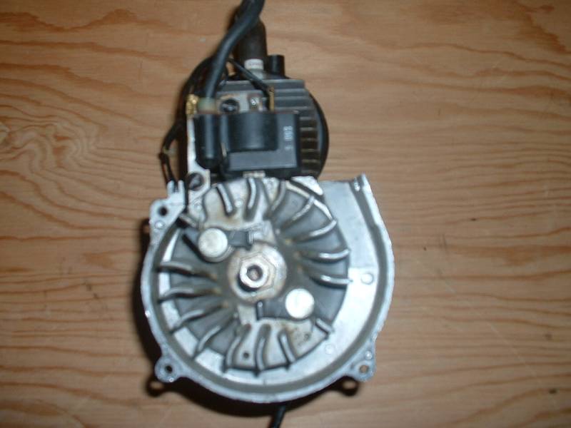 I have had this trimmer engine for a very long time and now have an application in mind. The engine as pictured weighs 4 lbs 4 Ozs and has both carburetor and muffler in the back which is great for my application. The carb seats on a plastic adapter/spacer that can easily be removed and trimmed down, the front cover behind the flywheel is bolted to the crankcase and thus a conversion to glow running on E85/gas mixture is very attractive. My goal is to have the engine at no more than 40 ozs. ready to go into the airplane. The engine appears to be around 25 cc (1.3 Cu. In.)