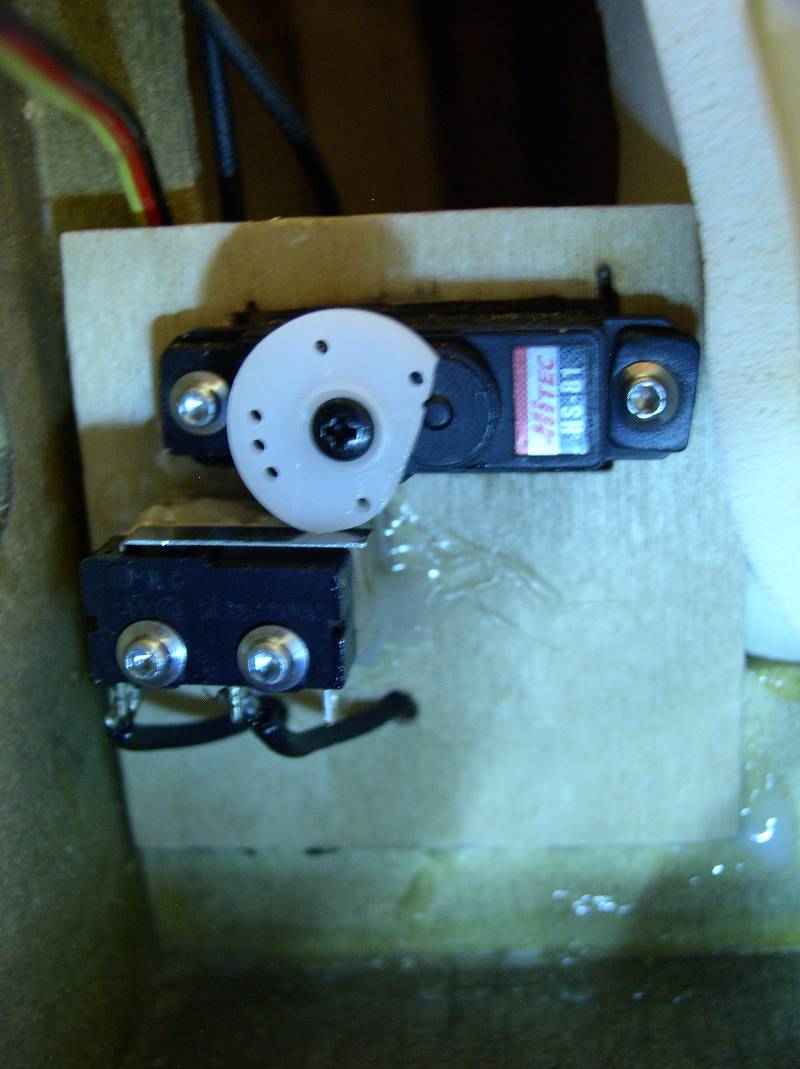 OK, no problem, I think I can do that. I bought a 250V 6A micro switch from Radio Shack, and wired it into the existing kill switch on the side of the fuse. I confirmed that all that original kill switch did was connect to ground to kill the engine, so I wired my micro switch in parallel. I made up a little piece of lite ply to hold the HS-81 servo close to the micro switch, and mounted it as far away from my Rx as I could. (Picture below) Now, when I flip my gear switch on my Tx, the servo trips the micro switch and kills the motor. And, my little homemade remote kill system does work just fine to kill the motor!