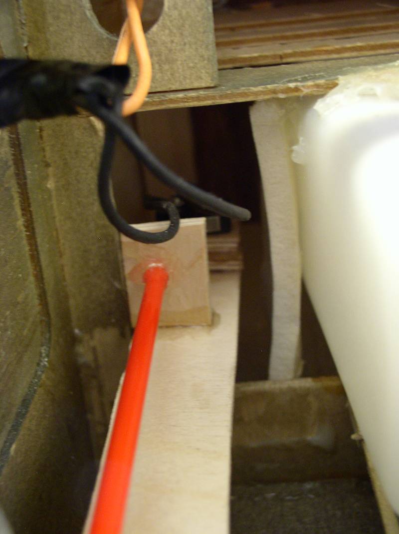 So, I went back to my kill switch idea. I mounted the micro switch 8" away from the servo, and as far away from the Rx as I could get it. I used a Sullivan plastic control rod to activate the switch, and made some braces from light ply to hold the plastic rod in place.