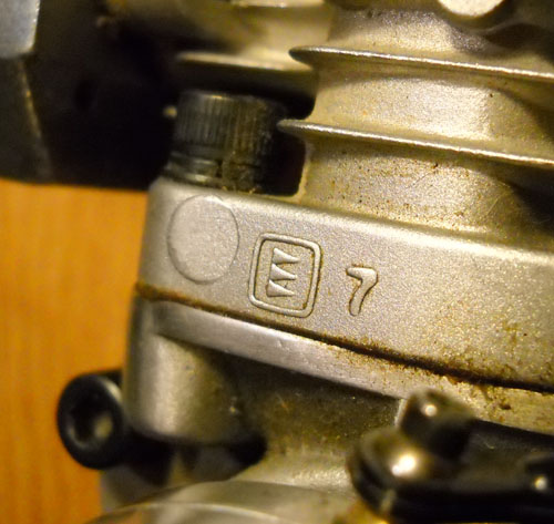 It seems to be a 25cc or smaller, it weighs 2.25 lbs. as shown, has a Zama carb with a small about 8mm intake, full crank sawn off in back. I'm guessing this is an older engine because it has mechanical timing which adjust with the carb, and I assume points ignition. Everything works very smoothly and it has decent compression. The only marking seems to be three stacked triangles and a 7.